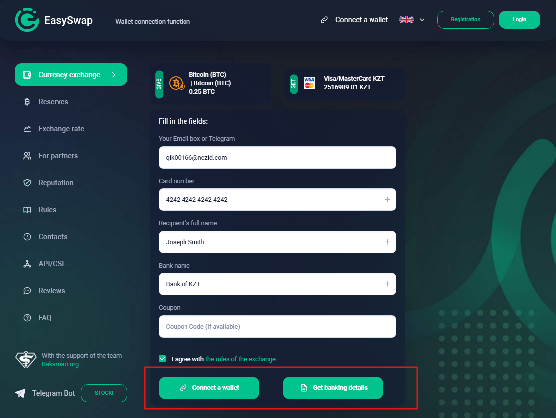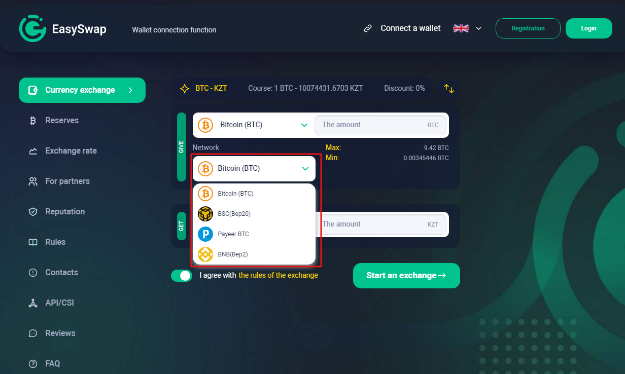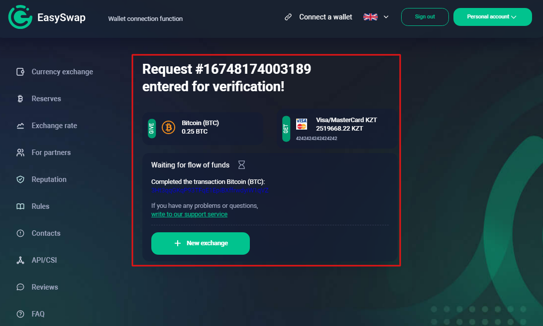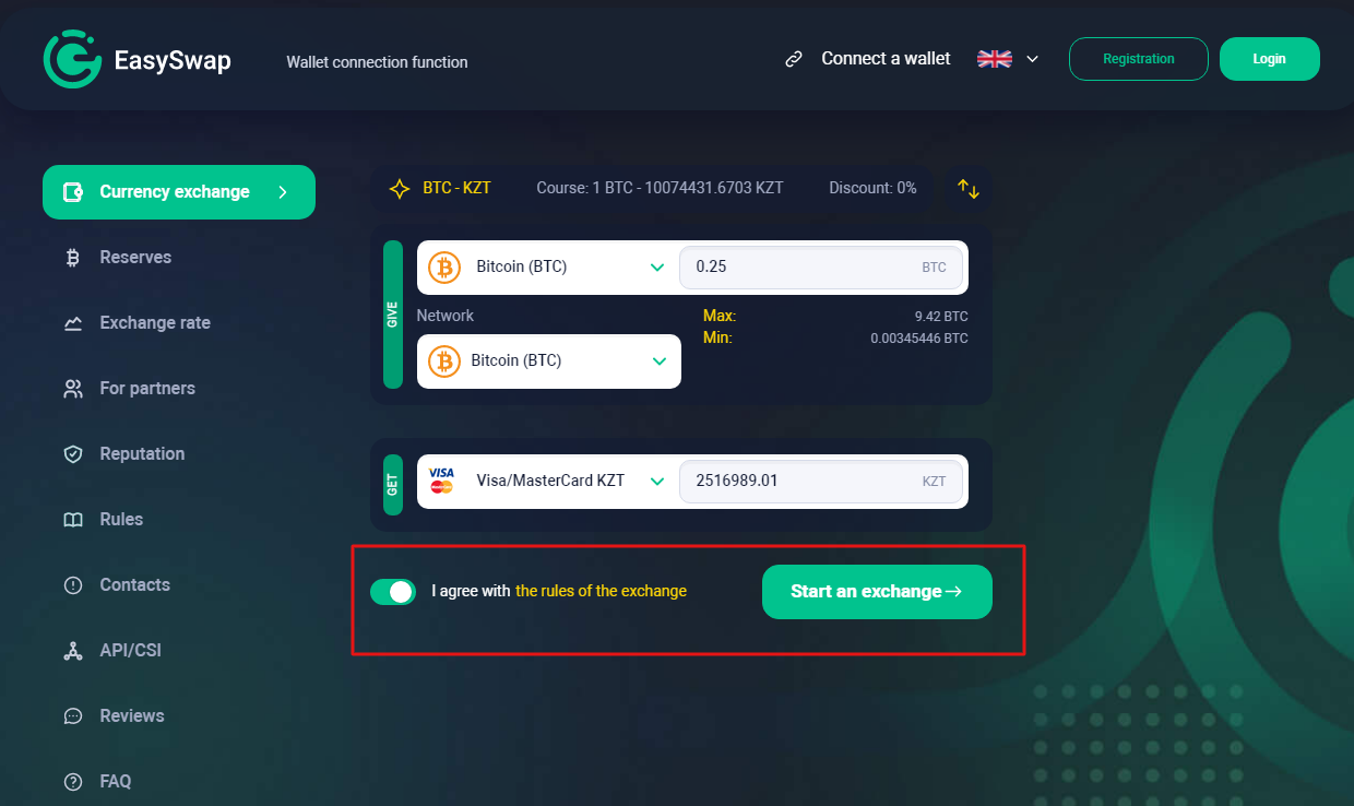 Değişim talebi oluşturma sürecini şu yön üzerinden inceleyelim: Bitcoin (BTC) – Visa/MasterCard KZT.